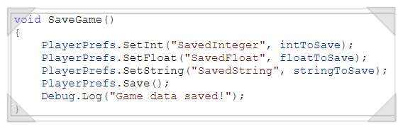 유니티 엔진에서 쉽고 빠르게 로컬 저장소를 활용하는 방법으로 PlayerPrefs 를 활용하는 방법이 있습니다. 아래와 같이 쉽게 데이터를 타입에 맞게 저장하고 불러올 수 있습니다.