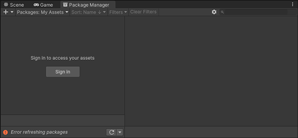 네트워크 연결은 작동하지만 Unity 계정에 로그인하지 않은 경우 패키지 관리자에 에셋 스토어 패키지가 표시되지 않습니다. 내 에셋(My Assets) 필터를 사용하려고 하면 패키지 관리자의 상태 표시줄에 위 오류가 표시됩니다.